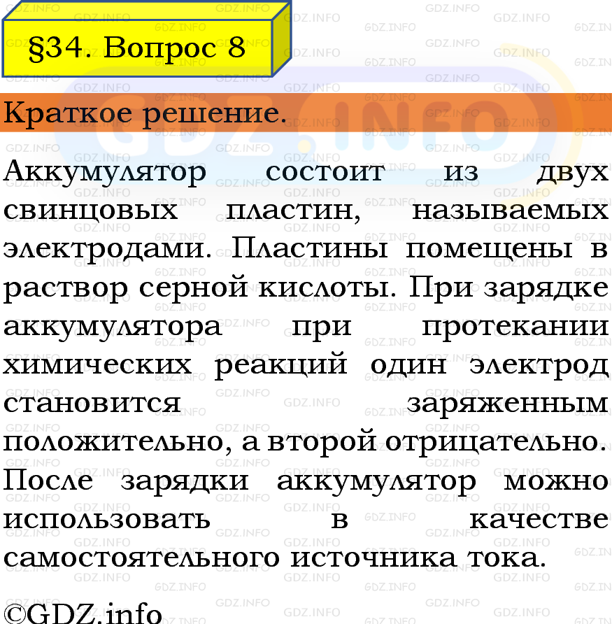 ГДЗ (готовое домашние задание из решебника) по Физике 8 класса авторов И. М. Перышкин, А. И. Иванов, Просвещение, 2023-2025г. ФГОС на Вопрос №8, § 34. Электрический ток. Источники тока.