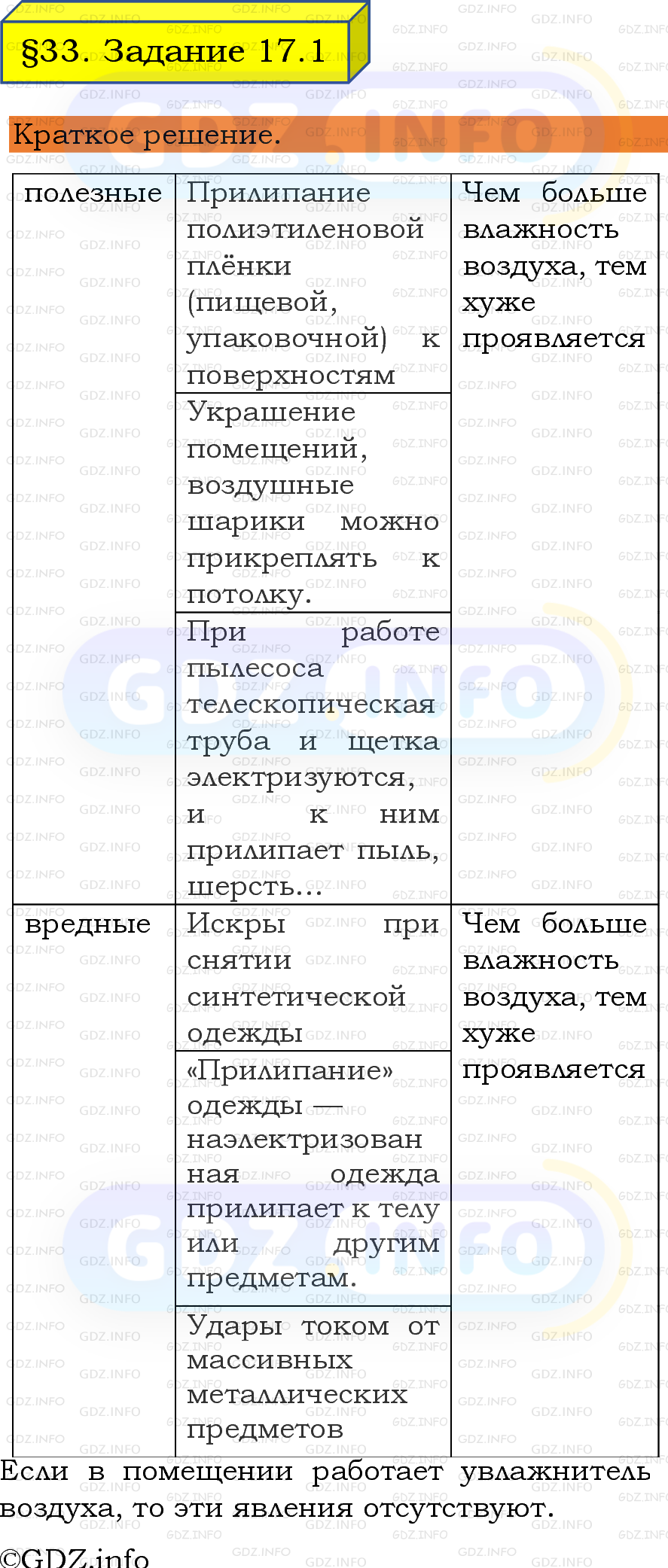 ГДЗ (готовое домашние задание из решебника) по Физике 8 класса авторов И. М. Перышкин, А. И. Иванов, Просвещение, 2023-2025г. ФГОС на Задание 17 №1, § 33. Применение статического электричества в технике и медицине.