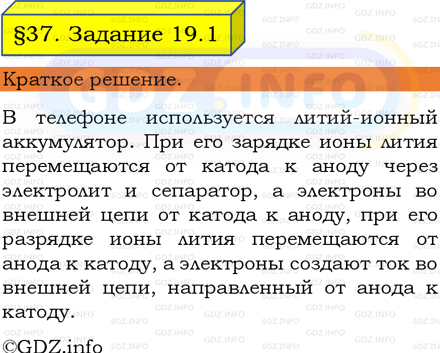 В настройках вашего смартфона найдите название его модели. Используя Интернет, выясните: относится ли аккумулятор вашего смартфона к одному из двух видов, рассмотренных выше, или же в смартфоне используется аккумулятор другого вида; какие частицы образуют электрический ток внутри этого аккумулятора и какие — во внешней цепи.