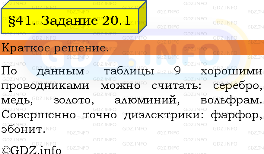 ГДЗ (готовое домашние задание из решебника) по Физике 8 класса авторов И. М. Перышкин, А. И. Иванов, Просвещение, 2023-2025г. ФГОС на Задание 20 №1, § 41. Расчёт сопротивления проводника. Удельное сопротивление.
