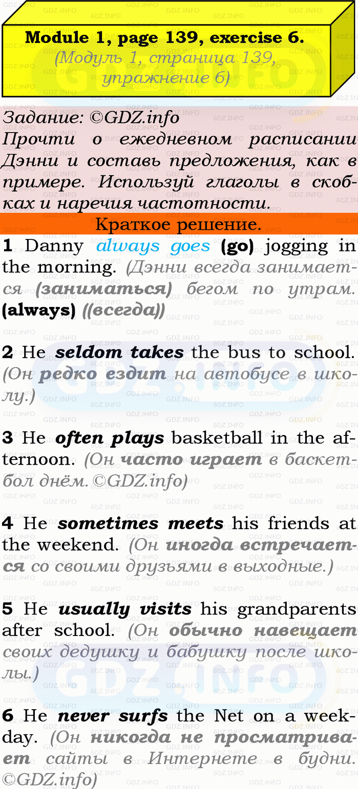 6 Read about Danny’s daily routine and make sentences, as in the example. Use the verbs in brackets and the adverbs of frequency.