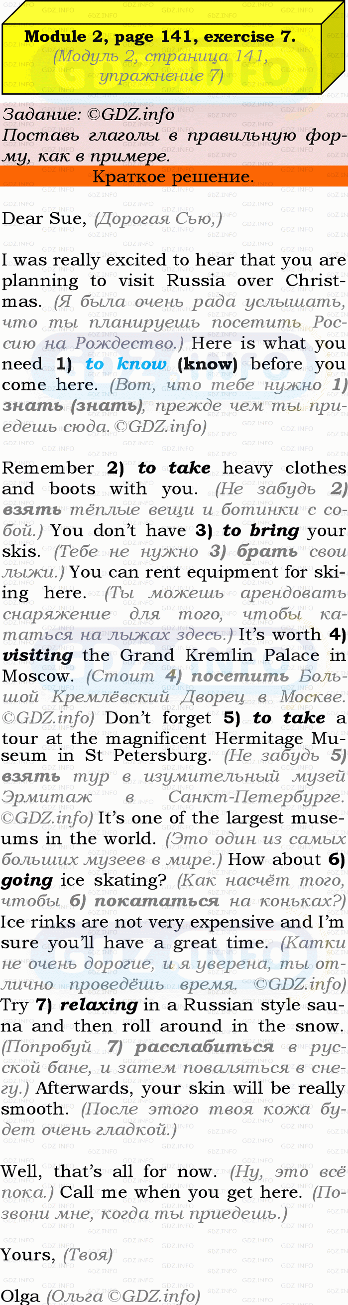 Remember 2) to take heavy clothes and boots with you. You don’t have 3) to bring your skis. You can rent equipment for skiing here. It's worth 4) visiting the Grand Kremlin Palace in Moscow. Don’t forget 5) to take a tour at the magnificent Hermitage Museum. It’s one of the largest museums in the world. How about 6) going ice skating? Ice rinks are not very expensive and I'm sure you’ll have a great time. Try 7) relaxing in a Russian style sauna and then roll around in the snow. Afterwards, your skin will be really smooth.