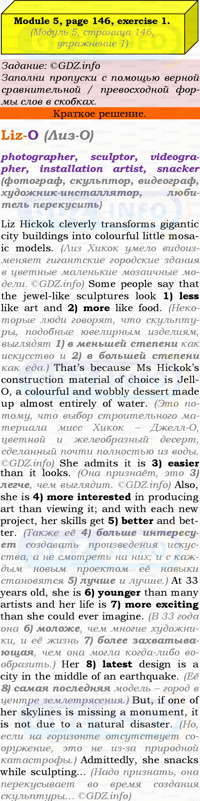 Liz Hickok cleverly transforms gigantic city buildings into colourful little mosaic models. Some people say that the jewel-like sculptures look 1) less like art and 2) more like food. That's because Ms Hickok’s construction material of choice is Jell-O. a colourful and wobbly dessert made up almost entirely of water. She admits it is 3) easier than it looks. Also, she is 4) more interested in producing art than viewing it; and with each new project, her skills get 5) better and better. At 33 years old, she is 6) younger than many artists and her life is 7) more exciting than she could ever imagine. Her 8) latest design is a city in the middle of an earthquake. But, if one of her skylines is missing a monument, it is not due to a natural disaster. Admittedly, she snacks while sculpting...
