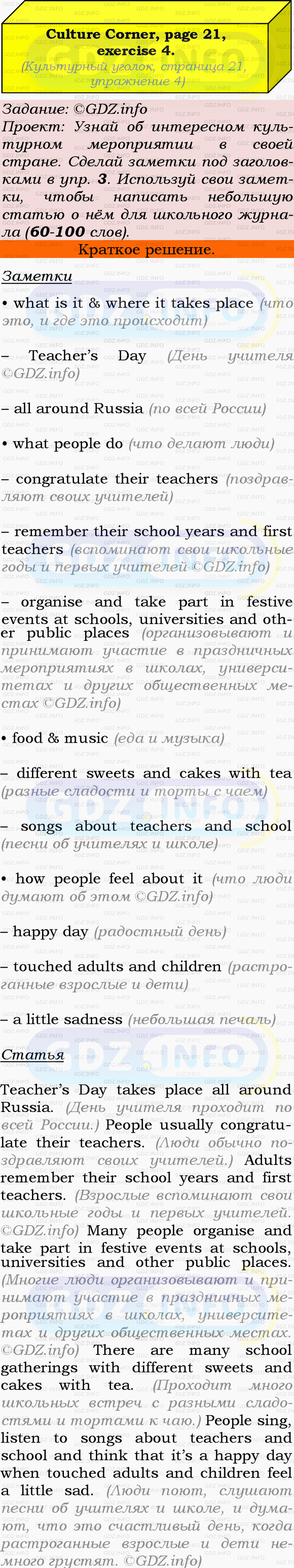 4 Project: Find out about an interesting cultural event in your country. Make notes under the headings in Ex. 3. Use your notes to write a short article about it for the school magazine (60-100 words).