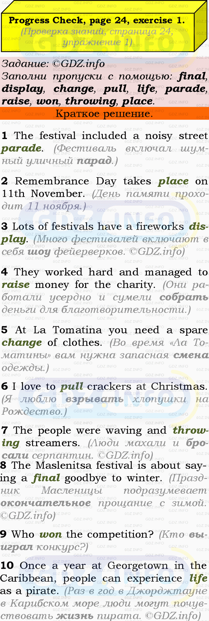 1 Fill in: final, display, change, pull, life, parade, raise, won, throwing, place.