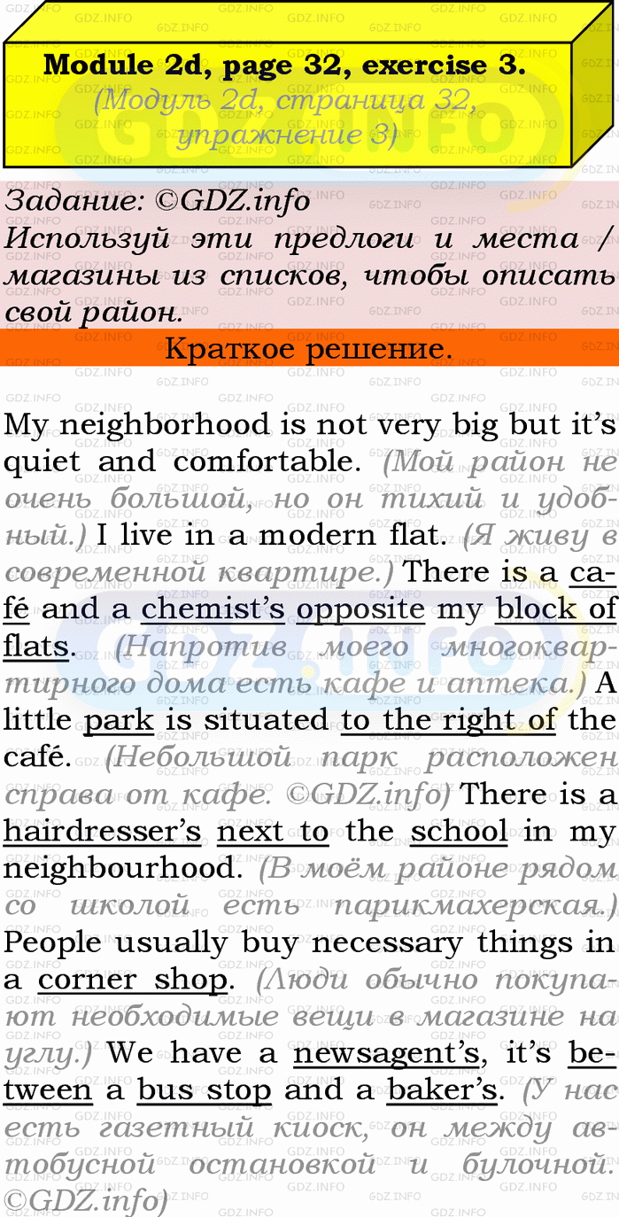 3 Use these prepositions and places/shops from the lists to describe your neighbourhood.Mind the order of adjectives.