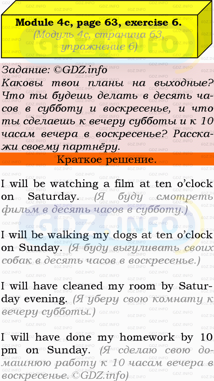 6 What are your plans for the weekend? What will you be doing at ten o'clock on Saturday and Sunday and what will you have done by Saturday evening and by 10 pm on Sunday? Tell your partner.