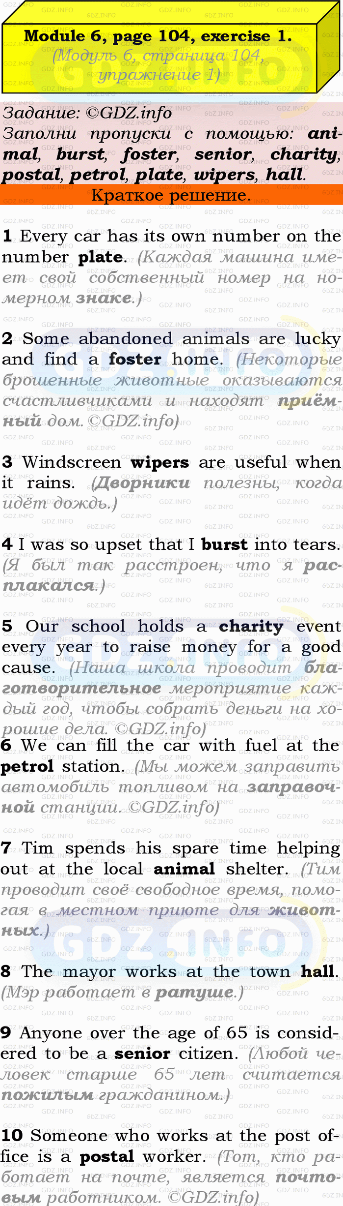 1 Fill in: animal, burst, foster, senior, charity, postal, petrol, plate, wipers, hall.