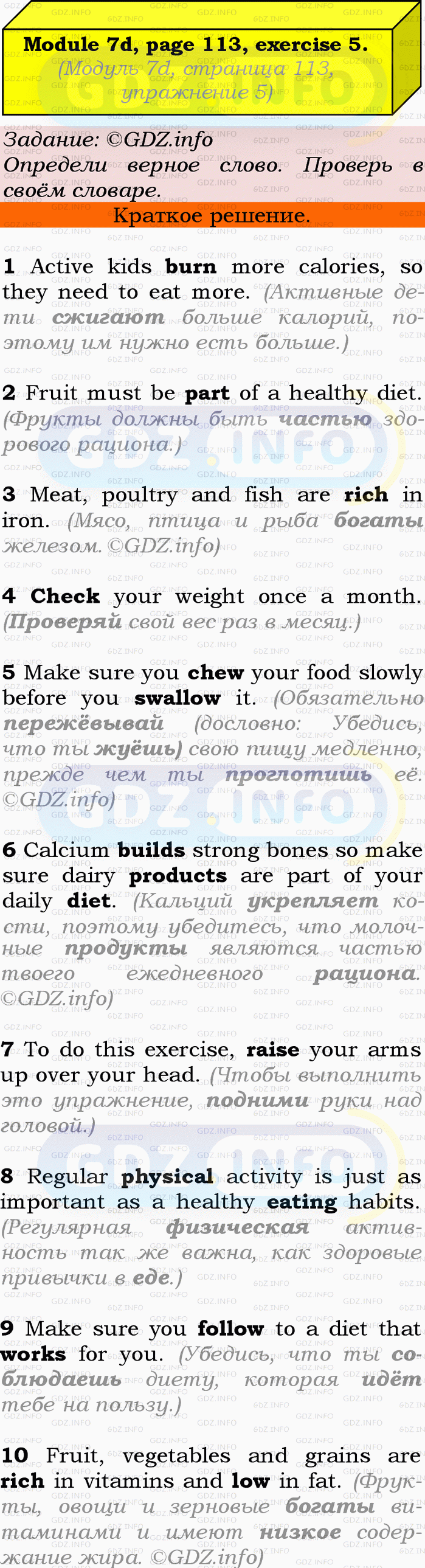 9 Make sure you follow/stay to a diet that works/does for you. 10 Fruit, vegetables and grains are full/rich in vitamins and short/low in fat.