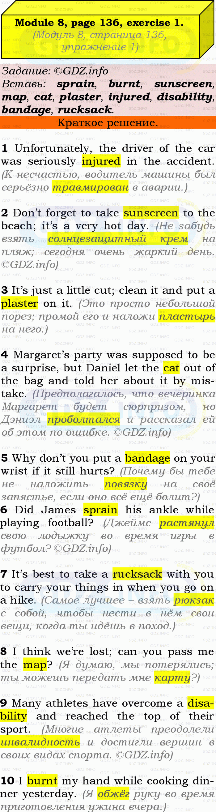 1 Fill in: sprain, burnt, sunscreen, map, cat, plaster, injured, disability, bandage, rucksack.