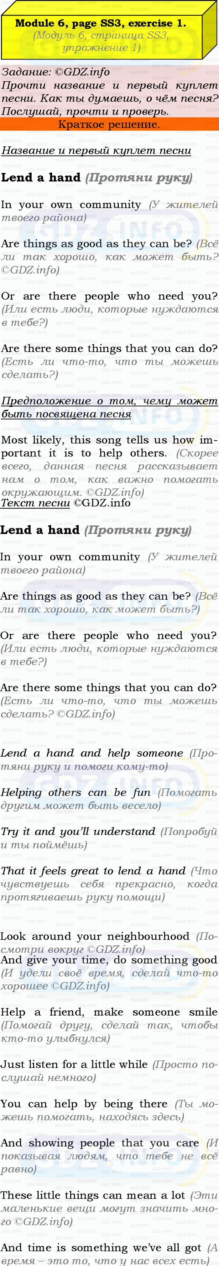 ГДЗ (готовое домашние задание из решебника) по Английскому языку 9 класса авторов Ю.Е. Ваулина, Просвещение, 2010/2019/2023г. на Song Sheets, Module 6, Номер 1. Страница SS3.Условие 2023 г.