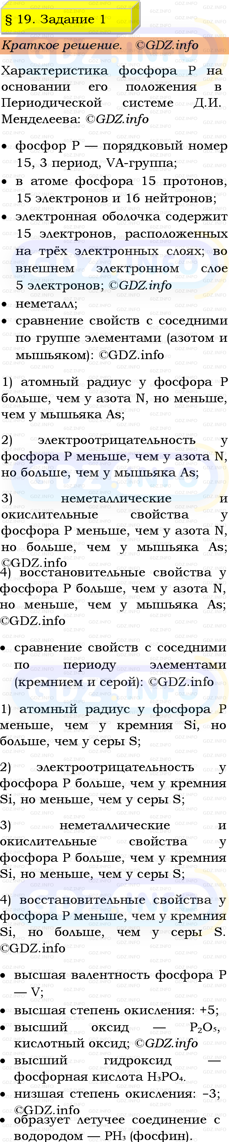 ГДЗ (готовое домашние задание из решебника) по Химии 9 класса авторов Габриелян Остроумов, Сладков. Просвещение, 2023-2025г на Номер №1, § 19. Фосфор и его соединения.