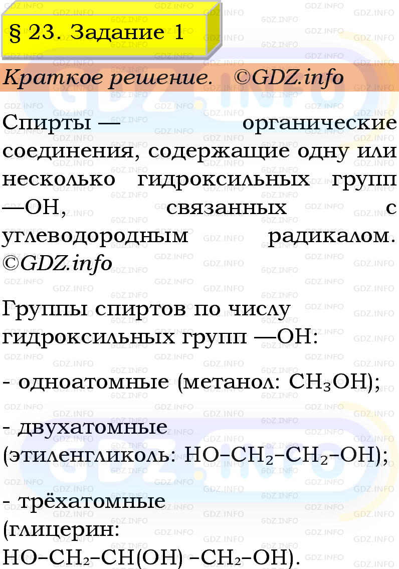 ГДЗ (готовое домашние задание из решебника) по Химии 9 класса авторов Габриелян Остроумов, Сладков. Просвещение, 2023-2025г на Номер №1, § 23. Кислородсодержащие органические соединения.