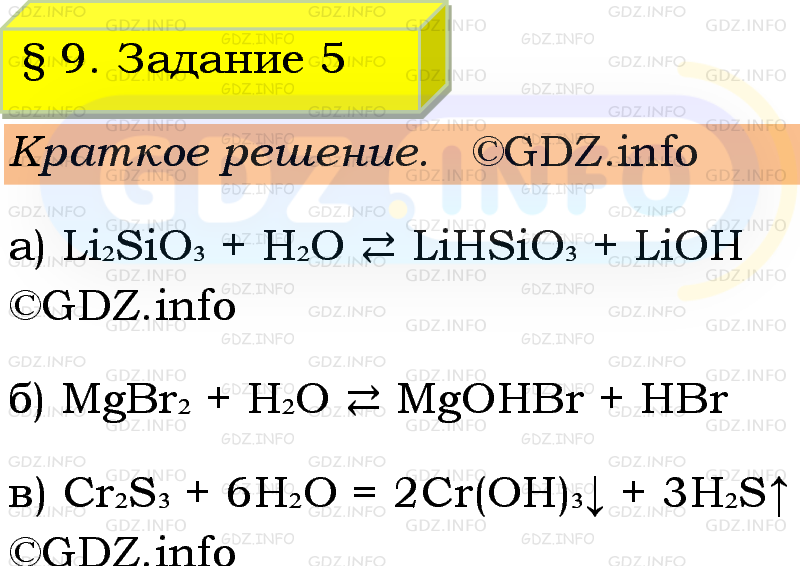 ГДЗ (готовое домашние задание из решебника) по Химии 9 класса авторов Габриелян Остроумов, Сладков. Просвещение, 2023-2025г на Номер №5, § 9. Гидролиз солей..