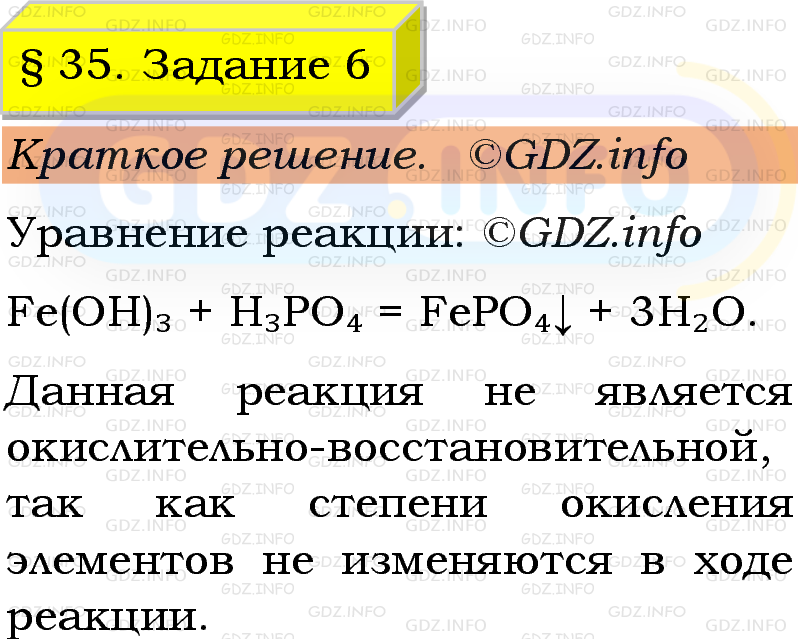 6. В состав преобразователей ржавчины, которые превращают рыхлый гидроксид железа(III) в тонкую прочную плёнку фосфата железа(III), входит фосфорная кислота. Напишите уравнение реакции, протекающей при обработке ржавой поверхности фосфорной кислотой. Является ли данная реакция окислительно-восстановительной?
