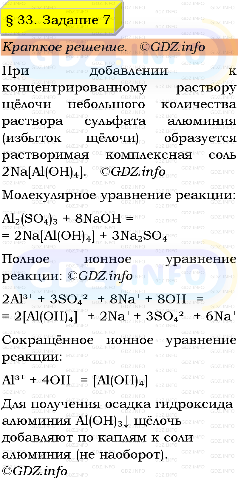 ГДЗ (готовое домашние задание из решебника) по Химии 9 класса авторов Габриелян Остроумов, Сладков. Просвещение, 2023-2025г на Номер №7, § 33. Алюминий и его соединения.