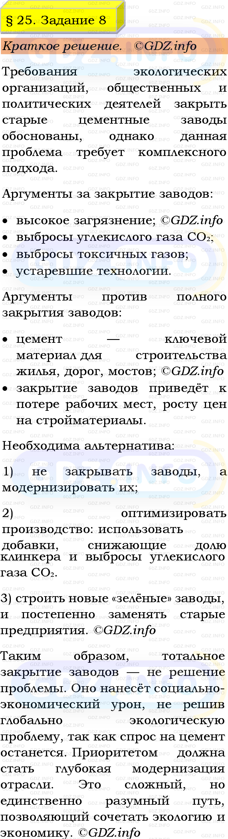 8. Выбросы цементного производства, особенно заводов, построенных в прошлом веке, наносят вред окружающей среде. Представители экологических организаций, общественные и политические деятели требуют закрытия таких предприятий. Выразите своё мнение относительно этих требований.