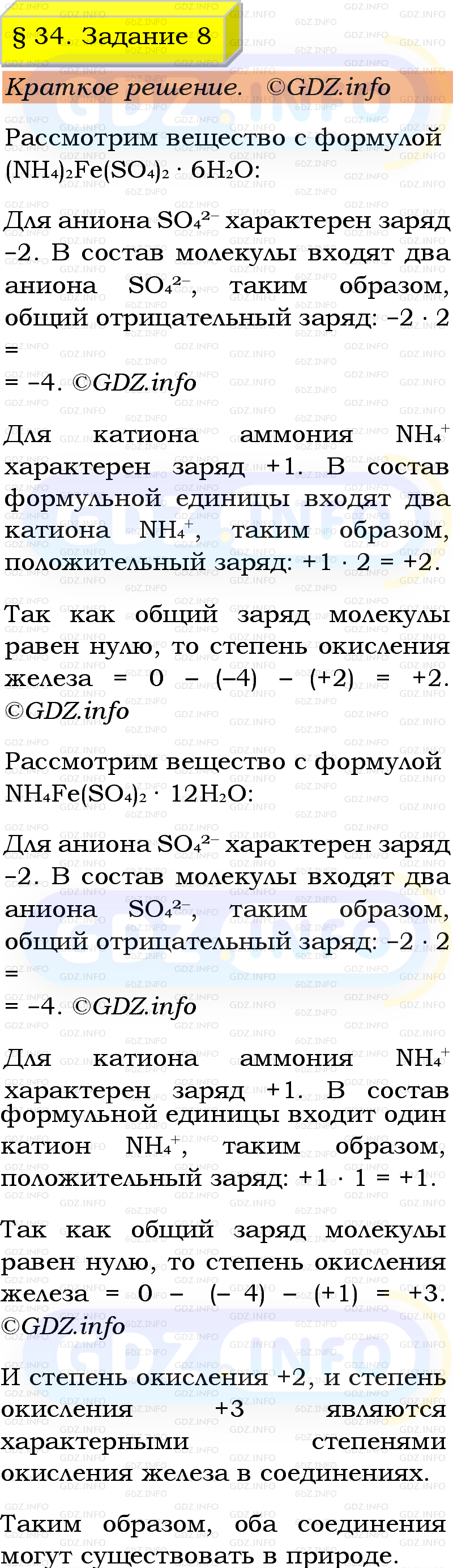 8. Один из учащихся написал формулу двойной соли железа и аммония как NH₄Fe(SO₄)₂ · 12H₂O, а другой — как (NH₄)₂Fe(SO₄)₂ · 6H₂O. Кто из них прав? Докажите ваше утверждение.