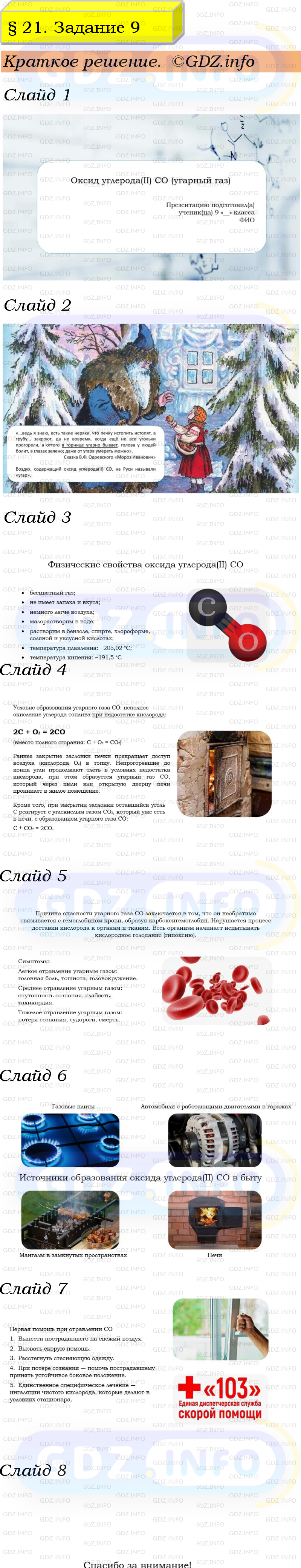 ГДЗ (готовое домашние задание из решебника) по Химии 9 класса авторов Габриелян Остроумов, Сладков. Просвещение, 2023-2025г на Номер №9, § 21. Кислородные соединения углерода.