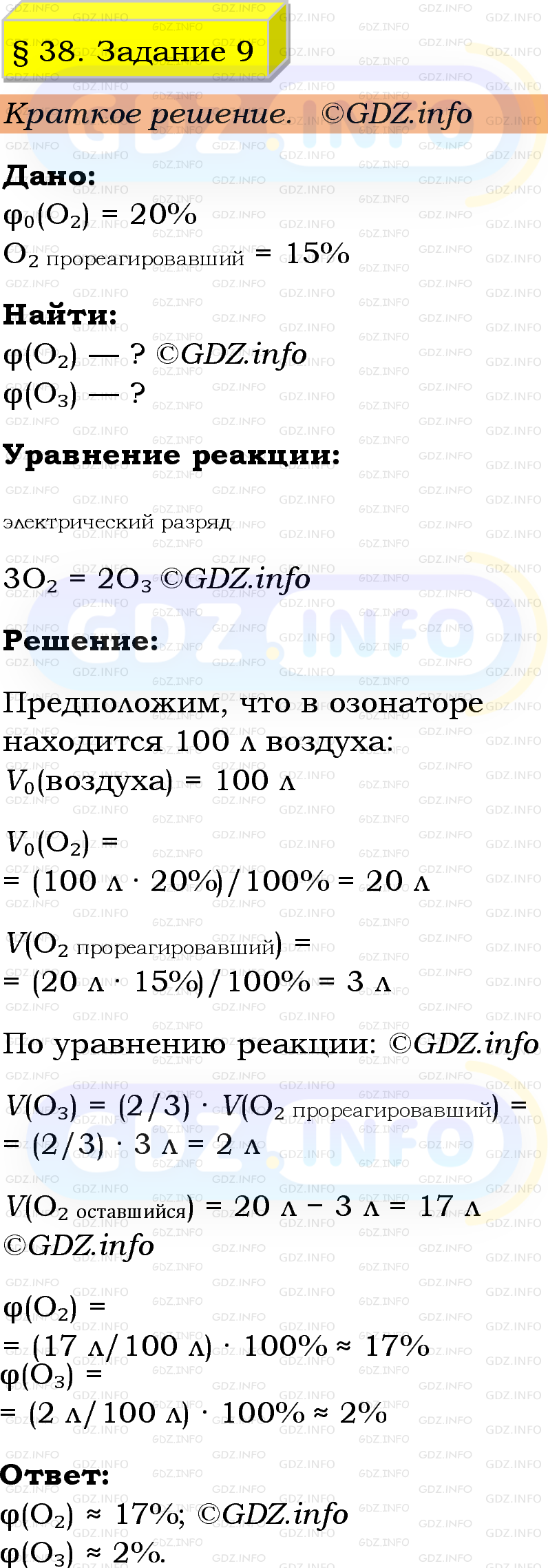 9. В озонаторе находится воздух с объёмной долей кислорода 20 %. При электрическом разряде 15 % кислорода превратилось в озон. Определите объёмные доли кислорода и озона в образовавшемся озонированном воздухе.