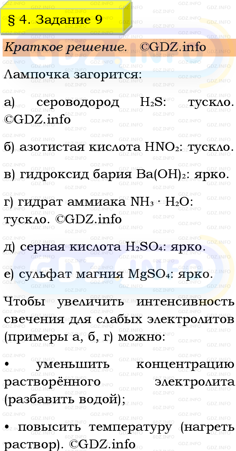 ГДЗ (готовое домашние задание из решебника) по Химии 9 класса авторов Габриелян Остроумов, Сладков. Просвещение, 2023-2025г на Номер №9, § 4. Электролитическая диссоциация..