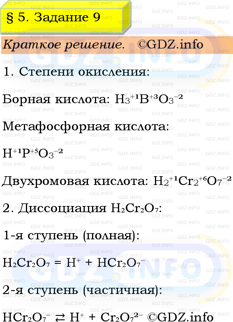 9. Определите степени окисления атомов в следующих кислотах: борная Н₃ВО₃, метафосфорная (НРО₃)ₙ, двухромовая H₂Cr₂O₇. Напишите уравнения ступенчатой диссоциации двухромовой кислоты, учитывая, что по первой ступени двухромовая кислота диссоциирует полностью, а по второй — частично.